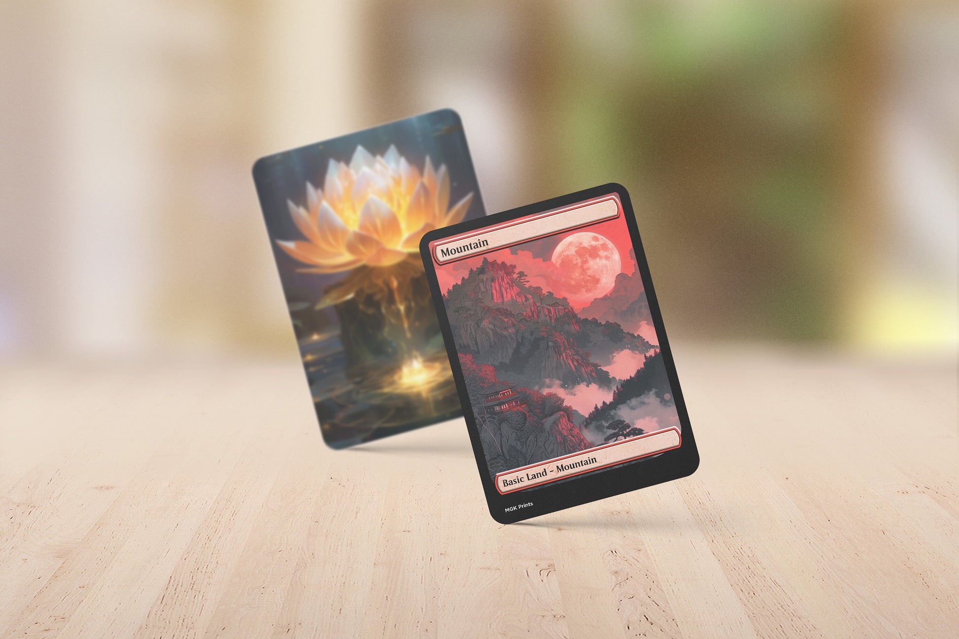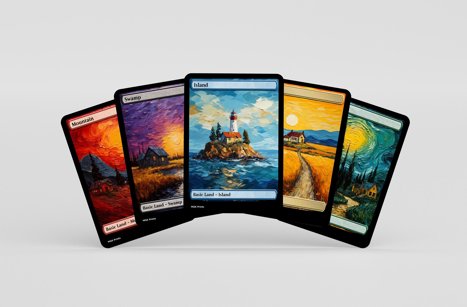Custom made set of Basic Mountains (Van Gogh and Japanese Hokusai) to bring a new style to each magic game! Made with high quality materials to ensure they feel just the same as all other cards being used!